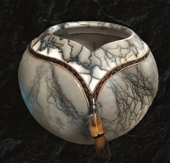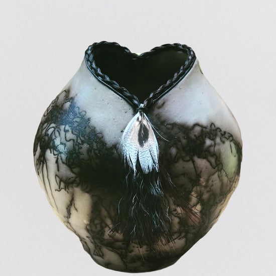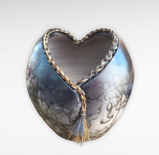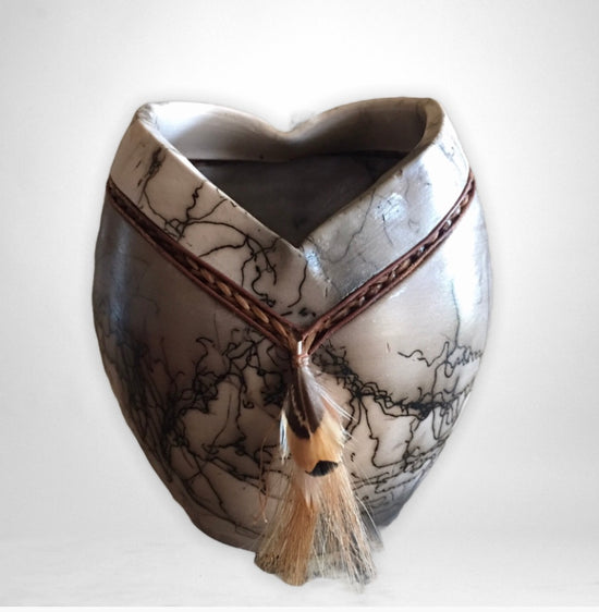 This hand thrown piece has a heart shaped opening. It's embellished with and a four part horse tail round braid lined with leather burrowed in the pottery to create a fluid look. The approximate size is 6" tall x 5 1/2" wide