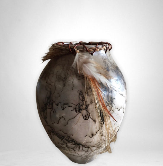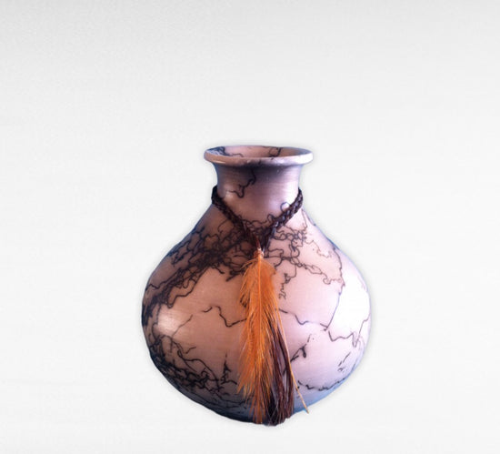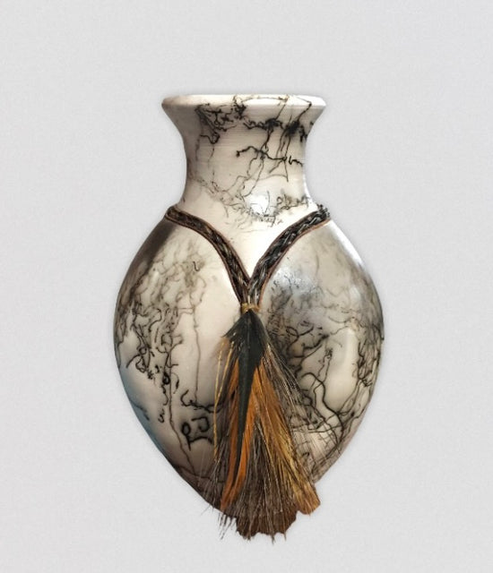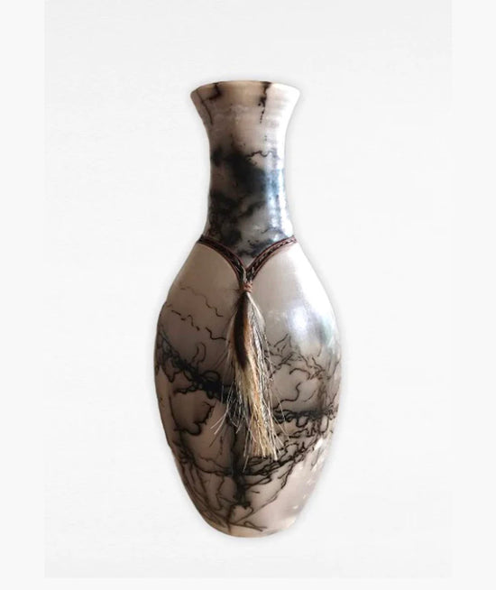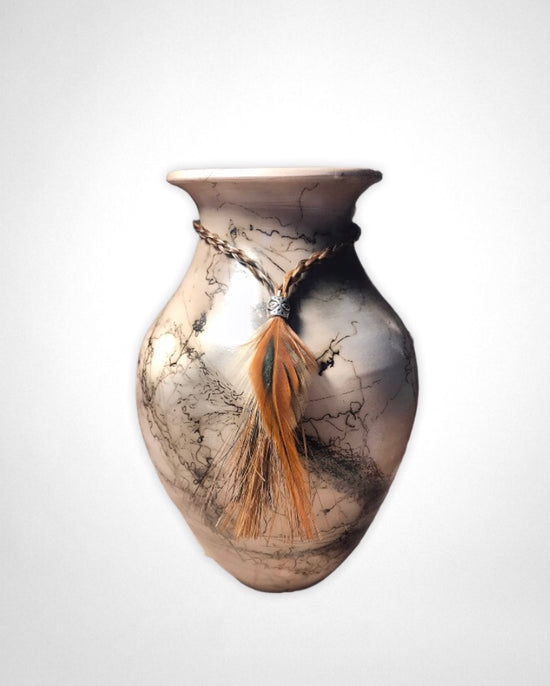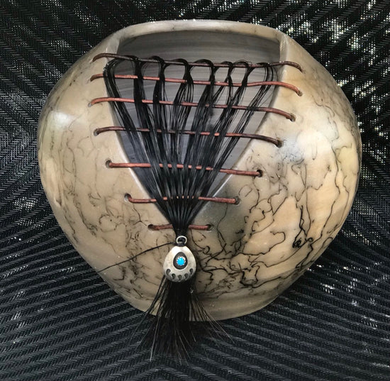 This tall cylinder shape is accented with a four part round horse hair braid. The braid is set into the pottery. lined with leather, and finished with a feather accent tassel. The approximate size is 8 1/2" tall x 4 1/2" wide