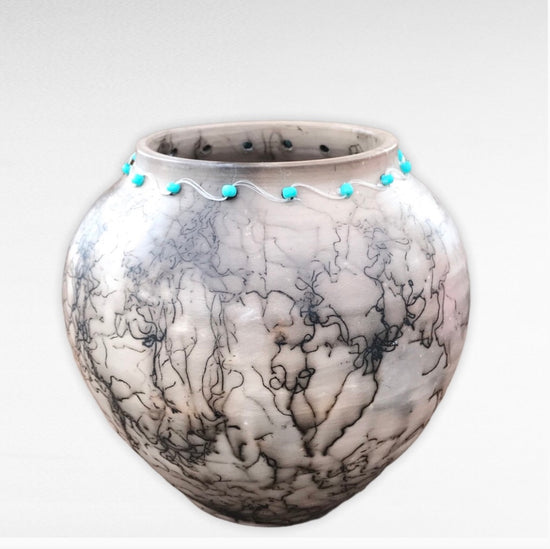 This piece is hand thrown and embellished with horse hair stitched through turquoise beading. The approximate size is 5 1/2" tall x 4 1/2" wide