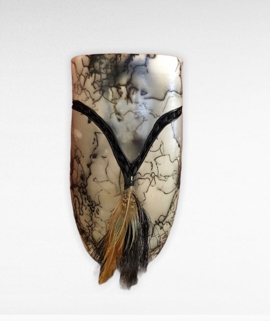 This piece has a wide shoulder that closes off to a heart opening. The opening is finished off with a four part horse tail round braid accented with leather trim and a feather tassel. The approximate size is 7" tall x 6" wide